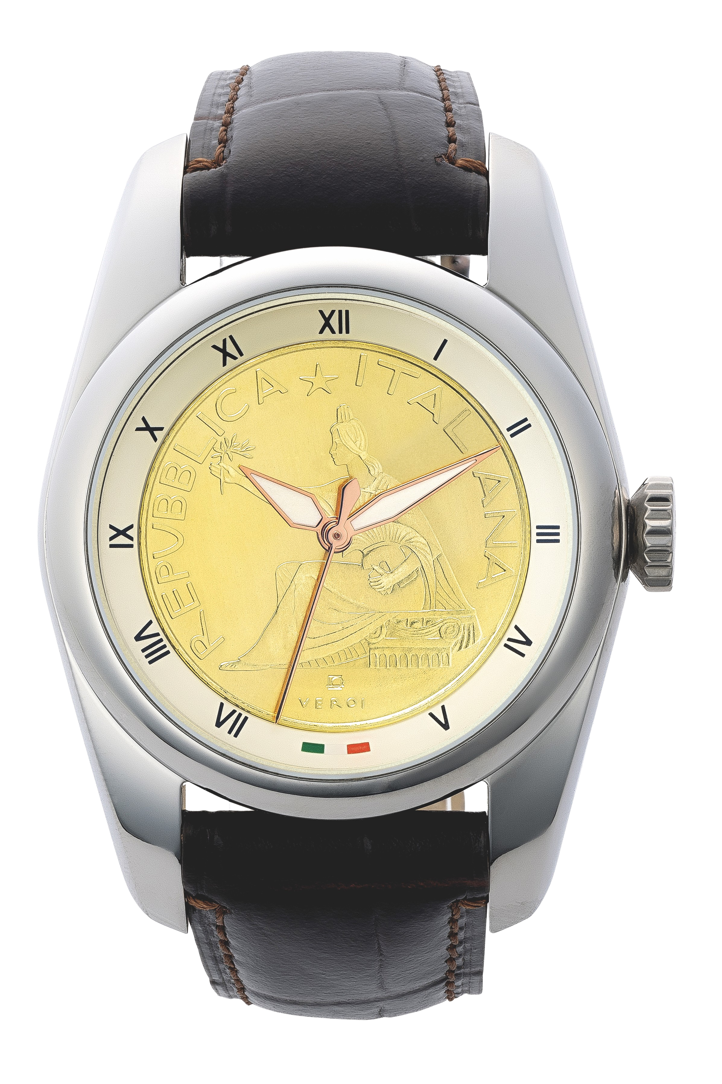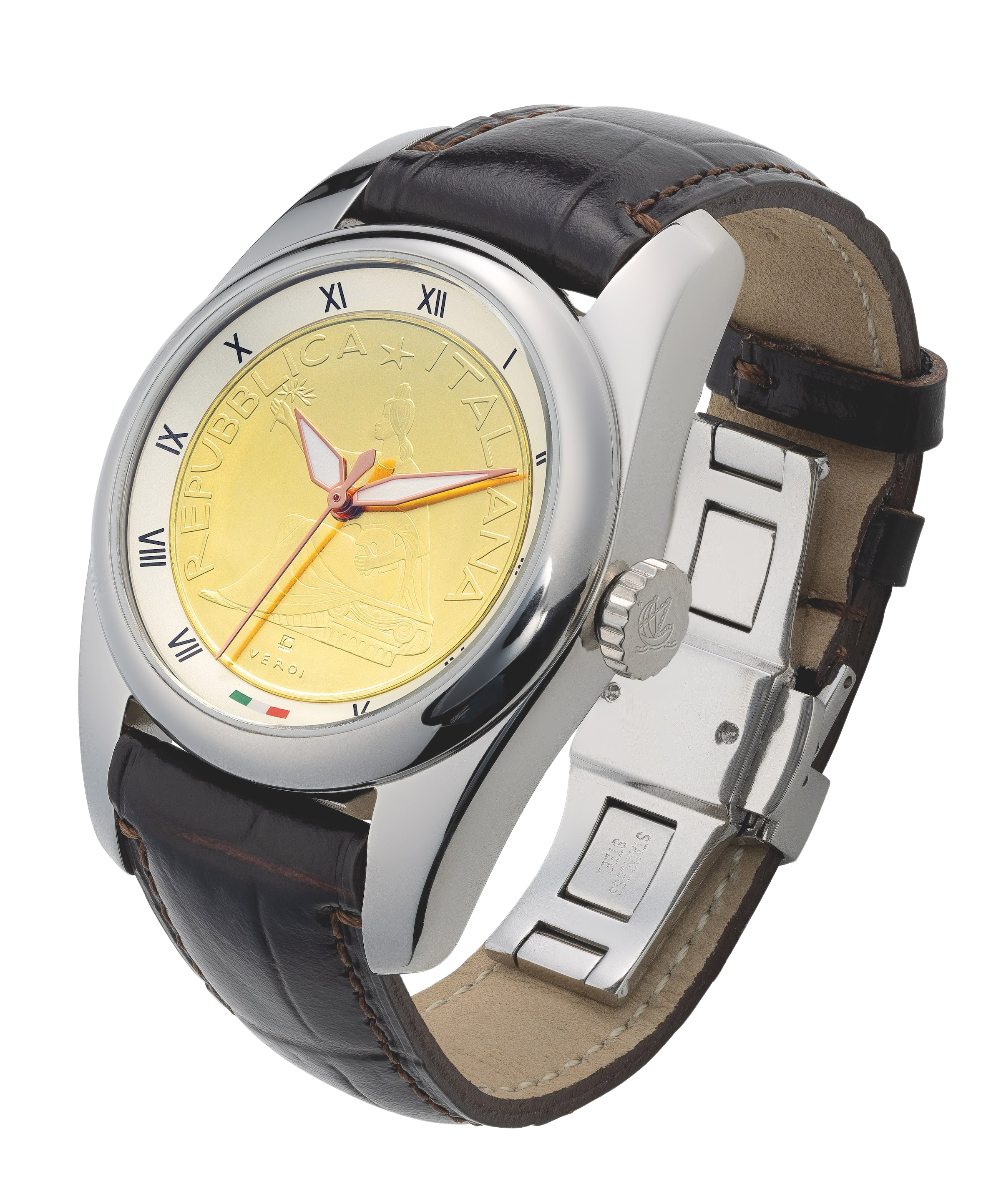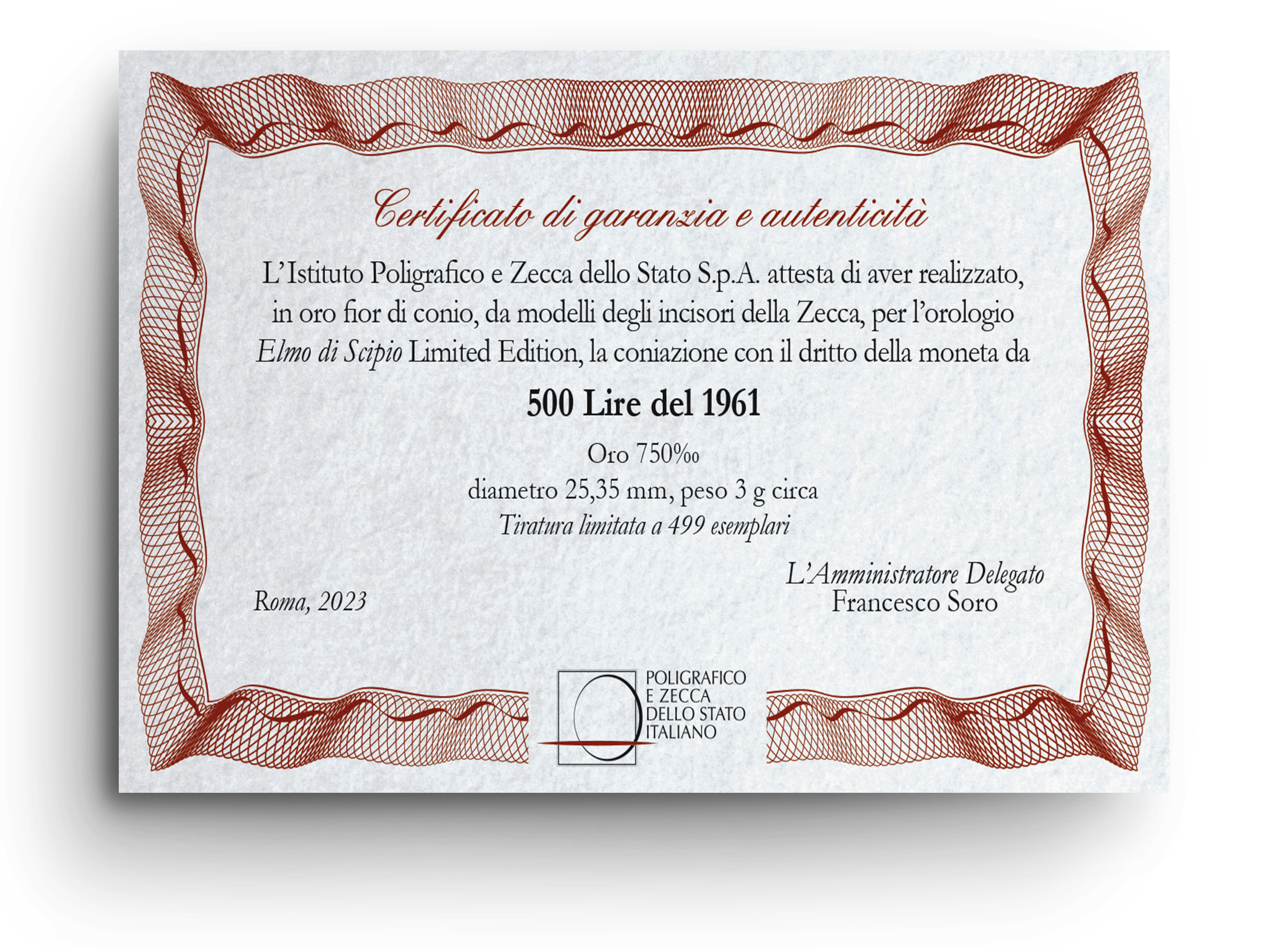 La coniazione in oro del dritto della riproduzione delle 500 lire del 1961 incastonata nel quadrante è stata realizzata dalla Zecca dello Stato in tiratura limitata.