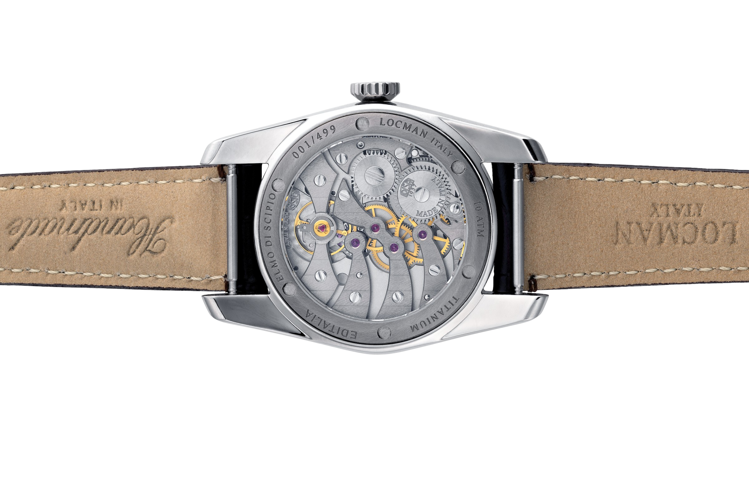 In titanio biocompatibile con oblò trasparente e movimento a vista. Scritte di personalizzazione: Editalia, Elmo di Scipio, Limited Edition, Indicazione numerica della tiratura limitata.